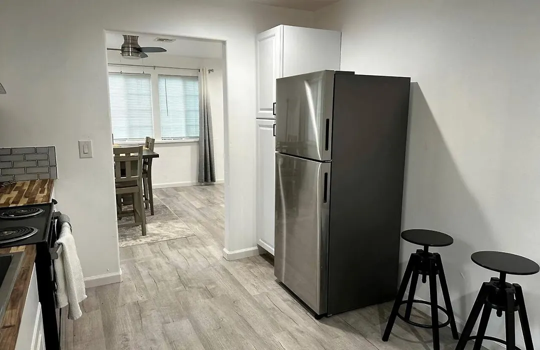 Cozy Nature-Filled Home With Garden & Night Sky Views Near Yosemite Tioga Pass, Groveland Ca has a full kitchen with a fridge.